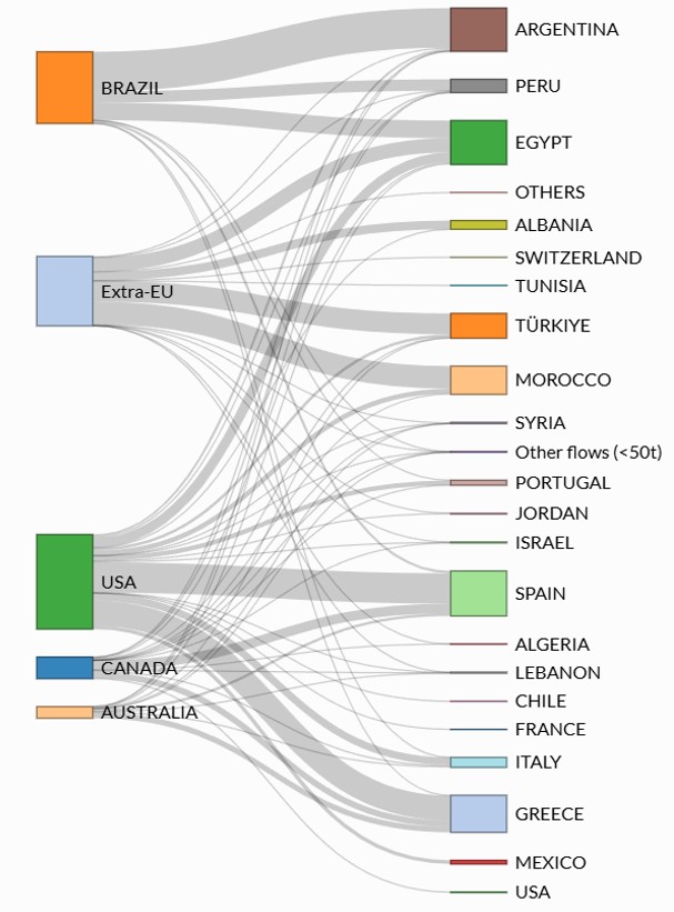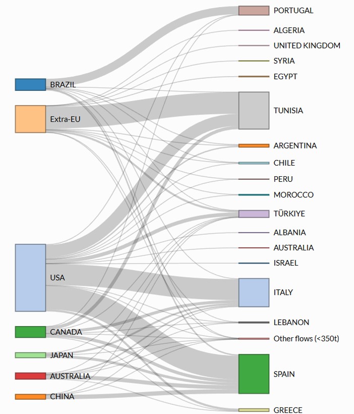 Figure 4. Olive oil import flows between selected importing markets and partner countries.