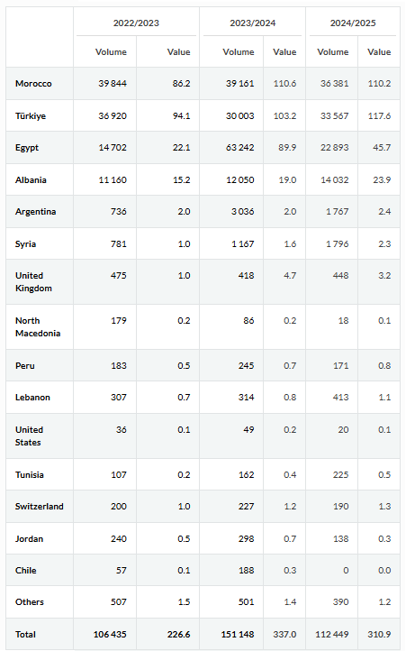 The main partner countries supplying these markets were Spain, Egypt, Argentina, Greece, Morocco and Türkiye.