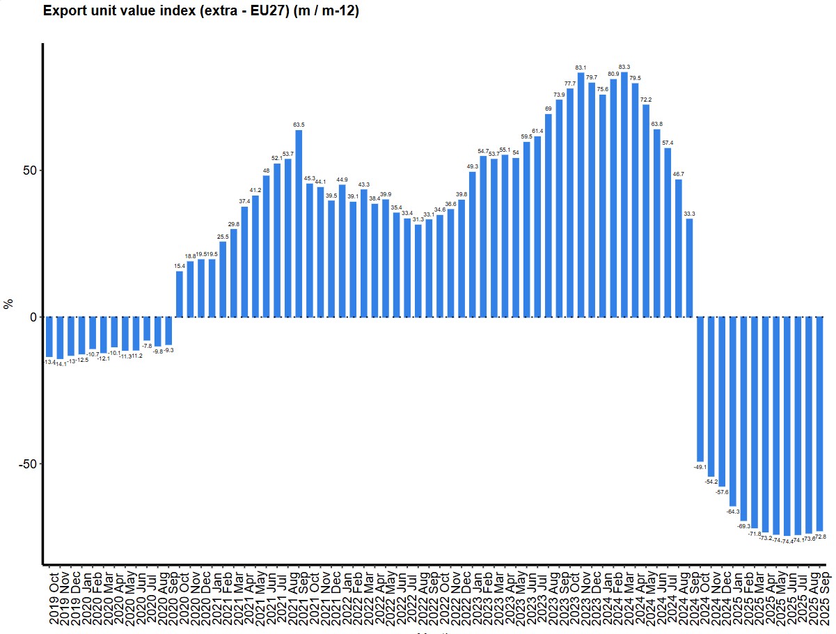 The unit value index shifted trend in March 2024 and in September 2025 fell by 72.8% compared with the same period of the previous crop year (-0.6% month-on-month).