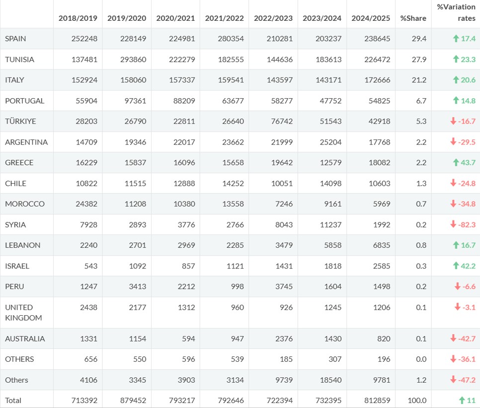 Table 5. Table olive imports by partner country (Crop years 2019/2020 – 2024/2025; September 2024 – August 2025) (t).