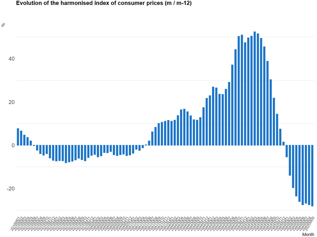 The Harmonised Index of Consumer Prices (HICP) for olive oil in the EU-27 decreased by 28.1% in September compared with the same month of the previous year, a sharper fall than in August (-2.0%). The index has maintained a downward trend since April 2024.